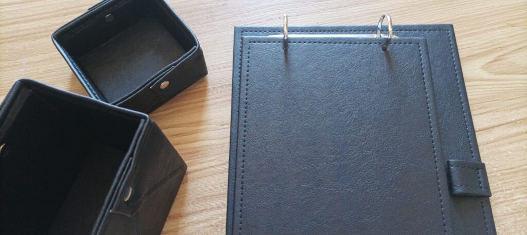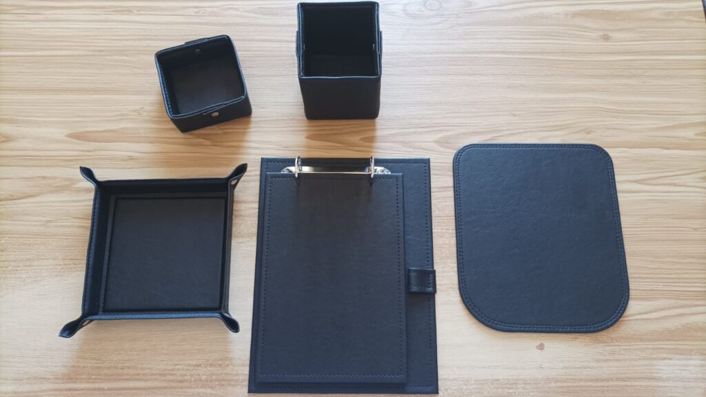 O kit foi desenvolvido para atender diferentes estilos de mesa, combinando bem com escritórios modernos ou clássicos. Sua textura sintética imita o couro, mas com maior resistência e sustentabilidade. Assim, você organiza documentos, canetas e acessórios com charme e durabilidade.